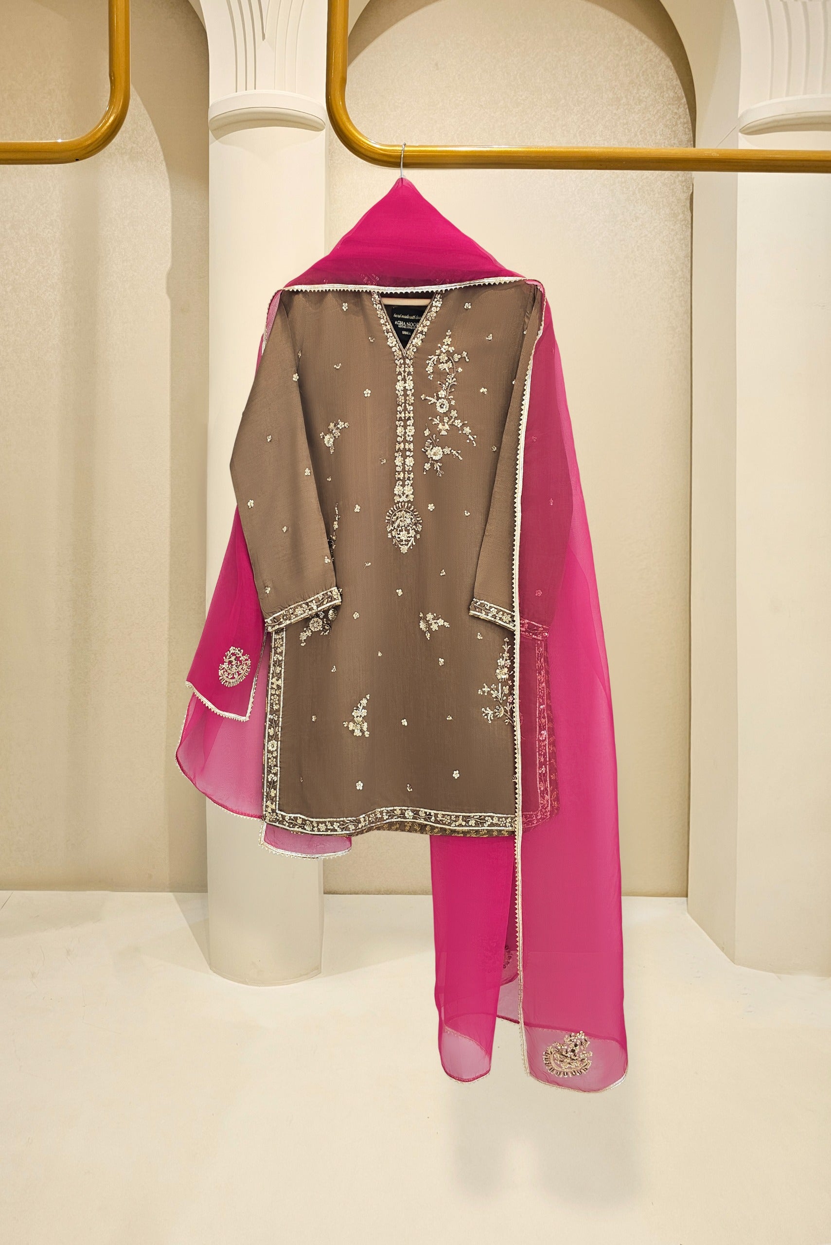 Brown khaddi silk embroidered shirt adorned with delicate silver embellishments and paired with a vibrant hot pink dupatta. A stunning festive outfit perfect for weddings, parties, and special occasions, blending elegance with a bold pop of color.