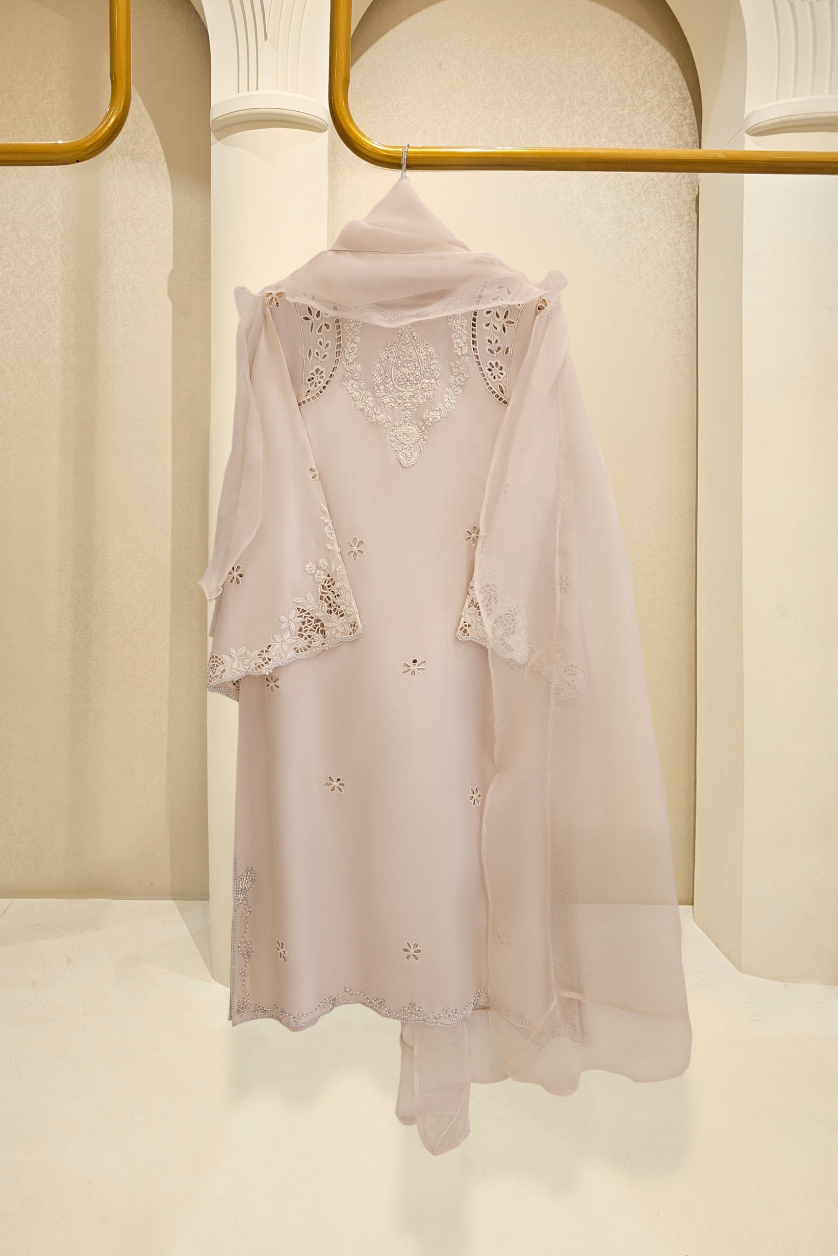 Elegant pastel pink raw silk shirt featuring delicate cutwork and intricate thread embroidery. Designed with refined detailing on sleeves and hem, this timeless outfit is perfect for weddings, festive events, and formal gatherings. A graceful choice for women who love minimal yet luxurious fashion.